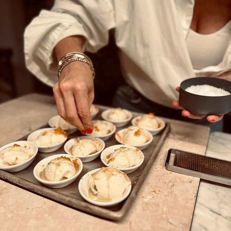 So I have started pre-scooping mini ramekins with the perfect curl of vanilla ice cream (“blue ribbon” curls well, my friend—stylist tip) and setting them in the freezer on a tray. Come the last drinks, I pull them out and drizzle them with VERY GOOD extra virgin olive oil (don’t scrimp here), a quick zest of orange, and a tiny jewel of flake salt.